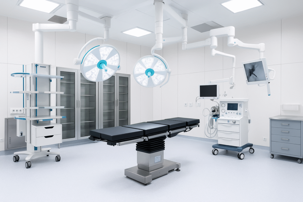 Niezwykle istotną rolę odgrywa infrastruktura techniczna — sufity podwieszane z kolumnami medycznymi, dostęp do gazów medycznych, niezależne systemy zasilania awaryjnego, monitoring warunków środowiskowych, a także integracja z systemami audiowizualnymi i IT, umożliwiająca komunikację wewnętrzną oraz rejestrację zabiegów.